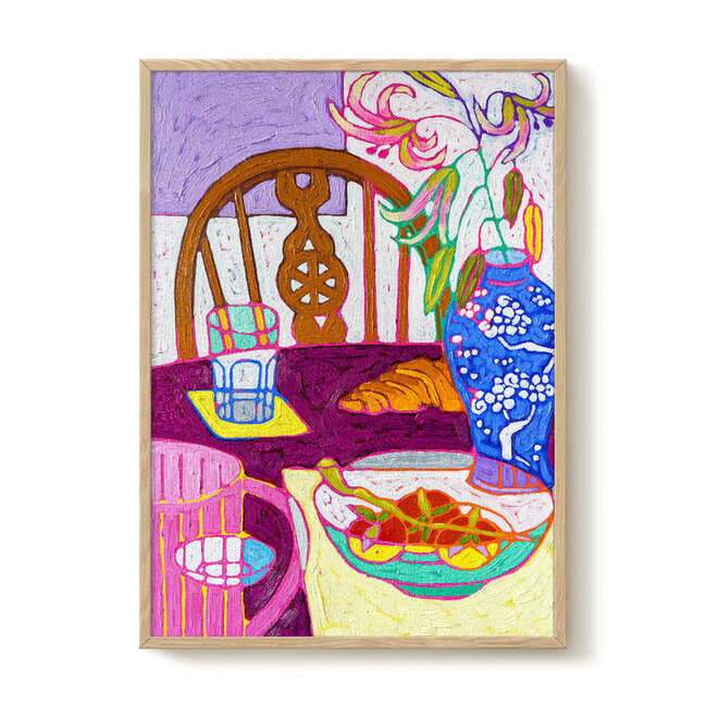 Deze poster toont het werk van Lisa Nooin, bekend om haar glas-in-lood geïnspireerde stijl met gelaagde kleuren. Haar kunst vangt alledaagse momenten op een frisse en speelse manier, met oog voor eenvoud en sfeer. Lees meer.