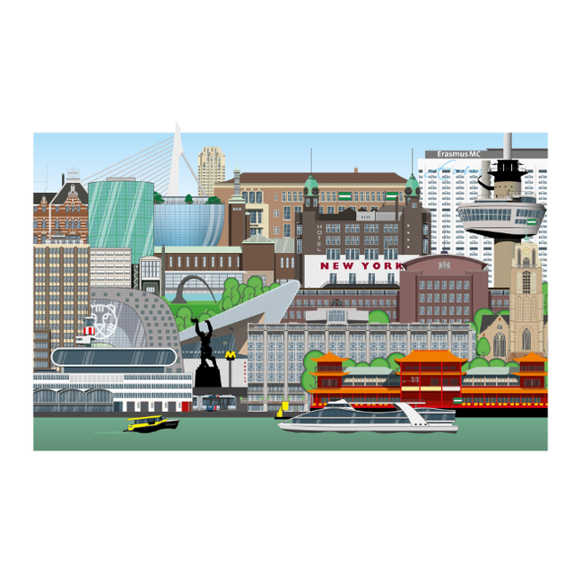 Breng Rotterdam tot leven in je interieur met Rotterdam The Original Poster. Deze liggende 60×40 cm art print toont iconische gebouwen zoals Hotel New York, de Laurenskerk, het Centraal Station en nog veel meer, in schitterende illustraties vol detail en karakter. Gedrukt op hoogwaardig papier met levendige kleuren en scherpe details, is het de perfecte eyecatcher voor liefhebbers van de stad — of als bijzonder cadeau.